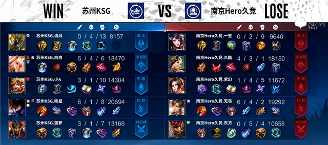 2分钟上路团战,澜拿下一血。2分33秒不知火舞被击杀。3分20秒暃拿下暴君。3分47秒双方互换边路一塔。4分27秒澜拿下主宰。5分10秒下路团战,南京Hero久竞打出0换2。7分钟澜拿下暴君。8分钟暃拿下主宰,团战双方1换1。9分钟虞姬被击杀。10分42秒中路团战,苏州KSG打出0换2。11分钟澜拿下暴君。11分10秒公孙离推掉中路一塔,廉颇被击杀。11分50秒暃拿下主宰。13分钟双方互换边路二塔。16分30秒暃拿下主宰。17分20秒暃拿下暴君。17分50秒中路团战,暃被击杀,南京Hero久竞推掉中路一塔。19分钟鬼谷子被击杀。19分31秒高地团战,苏州KSG打出1换2。20分26秒澜拿下风暴龙王,鬼谷子被击杀。22分20秒上路团战,暃被击杀。22分50秒高地团,双方2换2,苏州KSG推掉上路高地塔。25分钟风暴龙王团,澜拿下风暴龙王,苏州KSG团灭南京Hero久竞。26分11秒苏州KSG推掉水晶拿下本场比赛胜利。