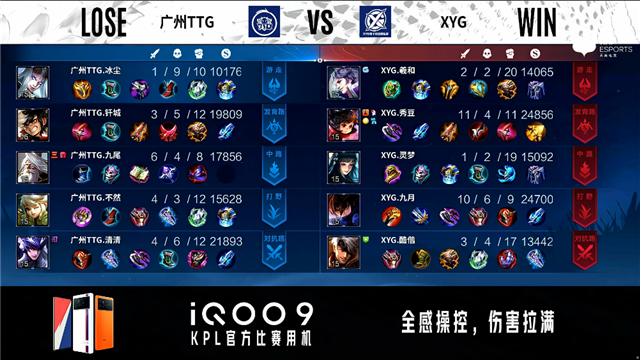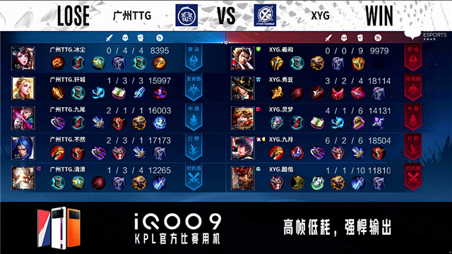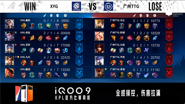 2分24秒,XYG控下暴君,随后双方团战2换2。4分08秒,XYG破掉广州TTG上一塔。6分11秒,广州TTG控下先知主宰。7分12秒,XYG控下暴君。9分40秒,广州TTG破掉XYG上二塔。10分钟,广州TTG破掉XYG中一塔。10分14秒,双方下路1换1。10分37秒,广州TTG控下暗影暴君。11分40秒,广州TTG控下暗影主宰,随后击杀刘邦。12分25秒,广州TTG破掉XYG中二塔,随后团战XYG打出2换4。14分28秒,广州TTG控下暗影暴君。15分10秒,XYG小兵破掉广州TTG上二塔,广州TTG击杀澜。15分50秒,广州TTG控下暗影主宰。16分22秒,双方团,XYG打出0换2。17分06秒,XYG破掉广州TTG中路两座外塔并击杀阿古朵。18分40秒,野区团,双方1换1。19分10秒,广州TTG控下暗影暴君。19分30秒,XYG击杀姜子牙。20分50秒,双方团,XYG打出0换3。21分17秒,XYG控下风暴龙王。24分20秒,下路团,XYG打出4换5团灭对手,李元芳拿下四杀。16分33秒,广州TTG抢下风暴龙王,随后打出1换2。27分08秒,广州TTG破掉XYG中高地。28分22秒,广州TTG破掉XYG下高地。28分48秒,广州TTG破掉XYG上高地,随后团战双方2换2。30分23秒,XYG李元芳抢到风暴龙王随后击杀东皇太一。31分33秒,XYG团战打出1换3,中路一波摧毁广州TTG水晶赢下比赛。