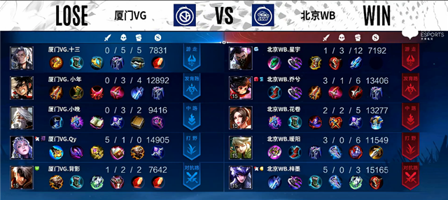 2分钟上路团战,厦门VG打出1换4,吕布拿下一血。2分47秒橘右京拿下主宰。5分钟娜可露露拿下暴君。5分40秒马可波罗推掉上路一塔,弈星被击杀。7分钟娜可露露拿下主宰。8分20秒野区团战,蒙恬被击杀。9分钟老夫子推掉下路一塔。9分25秒马可波罗被击杀。9分44秒娜可露露拿下暴君。11分钟娜可露露拿下暴君。11分25秒主宰团,北京WB打出0换4,北京WB顺势推掉中路所有防御塔。13分钟娜可露露拿下暴君。13分40秒野区团战,双方1换1。14分26秒周瑜推掉下路高地塔。15分钟河道团战,北京WB打出0换2。16分04秒北京WB推掉水晶率先拿下赛点。