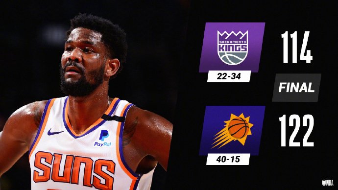 太阳(40-15):艾顿26分11篮板,保罗13分3篮板11助攻3抢断,克劳德5分7篮板2助攻,布里奇斯13分3篮板2助攻2抢断,布克23分3篮板4助攻,萨里奇8分4篮板,克雷格7分2篮板,卡梅隆-约翰逊6分3助攻,佩恩8分4助攻,杰旺-卡特13分3篮板2助攻