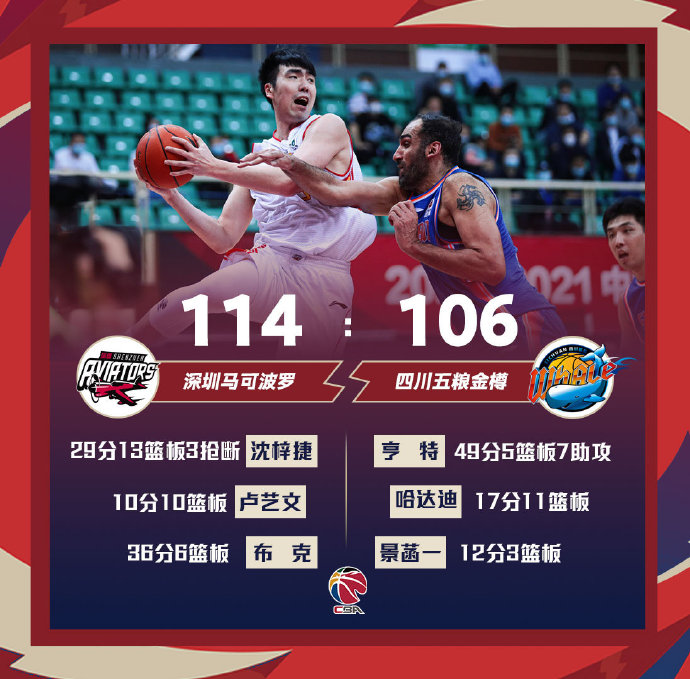 CBA常规赛继续进行,深圳和四川迎来季后赛卡位战,首节一上来,沈梓捷状态火热单节独得14分,首节结束时深圳率先占优,次节回来后深圳多点开花继续拉开比分,末段亨特突然爆发连得15分,半场战罢,四川50-53迫近分差。易边再战,亨特延续火热状态,单节他飚中3记三分独得13分,三节结束后四川反超3分,末节上来后双方你来我往陷入僵持,决胜时刻亨特连得10分,但布克突然爆发连中三分,亨特绝杀三分不中,双方打平进入加时,加时赛中,布克延续状态对飚亨特,四川末段追分乏力,最终深圳114-106力克四川。