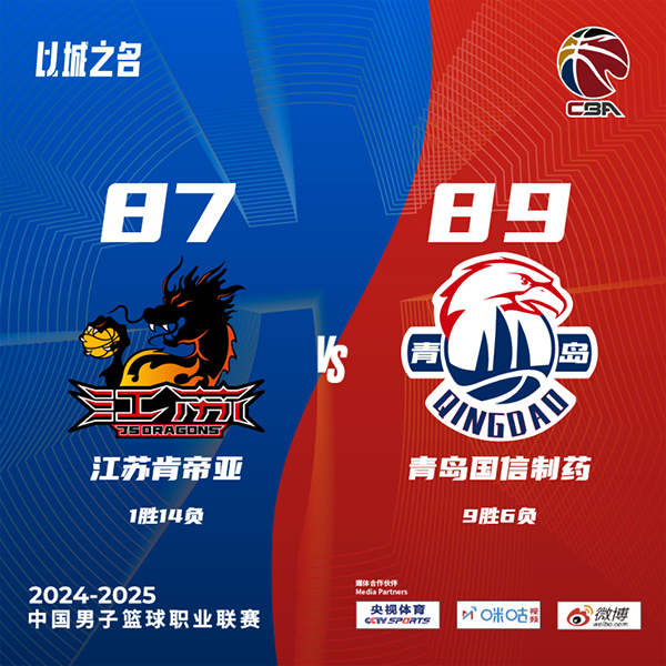 北京时间12月9日讯 CBA常规赛,江苏主场迎战青岛,江苏目前1胜13负排在积分榜第19位,青岛则是8胜6负排名第10,本场比赛青岛外援鲍威尔不打。比赛开始,双方上来十分慢热,随后韦瑟斯庞接连外线发炮连续取分为青岛开局,杰克逊接连杀伤回应,米奇内外线也能得分,青岛首节领先6分,次节青岛连续失误,进攻端也陷入停滞,江苏则是连续前场篮板拿到二次进攻机会,马国栋顺下暴扣助江苏半场反超2分。下半场,江苏一波8-0直接拉开双位数领先,随后江苏突然断电,青岛回应15-1反超比分,双方犯满后又接连犯规罚球,三节江苏领先4分,末节青岛连续三分不中,江苏再次扩大领先,随后双方展开拉锯战,江苏始终保持微弱领先,比赛进入白热化,双方都有关键失误,韦瑟斯庞中投绝杀,最终青岛89-87险胜江苏。