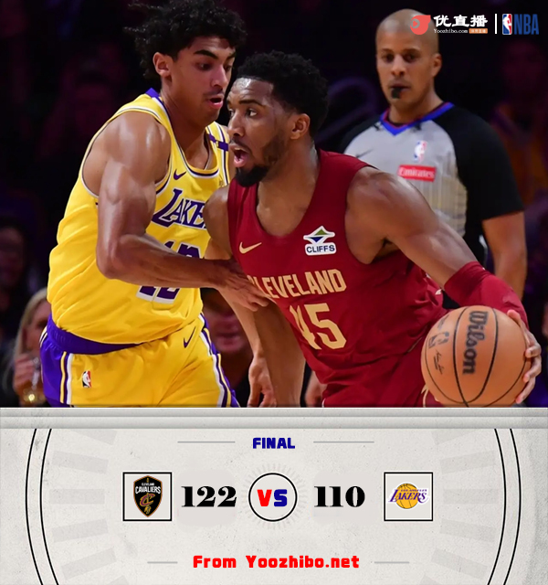 24直播网1月1日讯 NBA常规赛迎来焦点大战,湖人主场迎战7连胜的联盟领头羊骑士,詹姆斯40岁后首战老东家,湖人新援芬尼-史密斯和米尔顿迎来首秀,骑士本赛季面对西部球队8连胜。此役一上来詹姆斯外线早早开张,里夫斯与浓眉杀伤内线,但米切尔率队多点开花率先占优,中段骑士抓住机会开始发力,首节结束时骑士领先4分,次节回来,骑士进攻稍有停滞,詹姆斯两分打进后湖人一度反超,不过骑士迅速调整状态,内外结合一波9-0夺回优势,半场战罢,骑士继续领先5分。易边再战后两队陷入鏖战,浓眉予取予求持续发威,里夫斯串联全队,中段湖人回敬10-0小高潮打停对手,勒韦尔和米切尔连中三分稳住局势,三节结束后骑士保持9分优势,末节决战,里夫斯连续杀伤狂揽17分,詹姆斯与浓眉续上火力,湖人没有放弃苦苦追分,但骑士顶住压力,最终122-110击败湖人迎来8连胜。