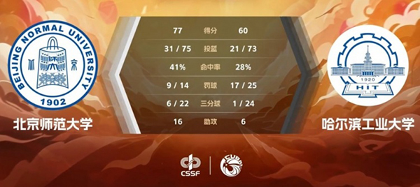 24直播网讯3月12日 CUBAL东北赛区小组赛,北京师范大学对阵哈尔滨工业大学。首场小组赛,两队皆获胜。比赛开始,吴士广篮下先拿2分为北京师大开局,哈工大开局很是慢热被北京师大打出9-0开局。打了3分钟杨淳君终于为哈工大开局,周鑫也连续得分,但吴士广补篮回应,肖洋三分开和后北京师大领先到双位数。周鑫三分再止血,吴士广继续二次进攻打成,首节北京师大26-12领先哈工大。次节上来,哈工大进攻端还是不在状态,北京师大顺势扩大领先。辛泽林造杀伤终于打破僵局,但两队进攻端命中率都不高,场上频频打铁。随后高梓淇接连三分命中帮助北京师大稳住领先优势,杨淳君连续前场篮板终于打成二次进攻拿到运动战进球得分,半场北京师大43-26继续领先哈工大。易边再战,双方连续几回合尝试三分但都没有命中,打了3分多钟各自仅得2分。杨淳君冲击造杀伤、强打2+1带队追分,北京师大及时调整,邵振恒站出来连续抢到前场篮板,里突外投三分也开和砍下7分强势回应。哈工大还是依靠拼抢前场篮板获得进攻机会,连续罚球追分,但三节北京师大57-46还领先哈工大11分。末节决战,双方上来又是连续打铁,邵振恒连攻加传帮助北京师大牢牢掌握住十几分领先。江龙接连打成二次进攻止血,但肖洋三分被犯规后三罚全中再回应,随后肖洋里突外投再连得6分杀死比赛,最终北京师大77-60战胜哈工大。