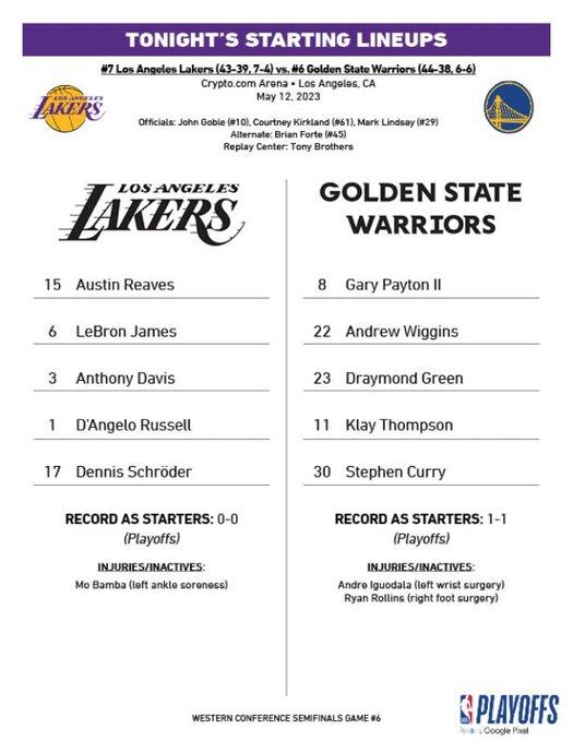 24直播网05月13日,NBA季后赛湖人和勇士G6关键战来了,两队首发正式出炉,维金斯带伤出战,勇士继续使用死亡五小首发;湖人变阵,施罗德顶替范德比尔特进入首发,哈姆终于变阵了,浓眉免遭脑震荡,继续带伤出战。