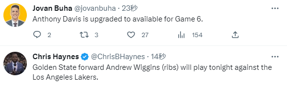 G6赛前,维金斯参加了部分投篮训练,随后接受肋骨伤势的治疗,赛前热身时,维金斯测试肋骨伤病,整个人的状态很好,最终维金斯决定带伤出战,勇士将监控他在场上的反应。