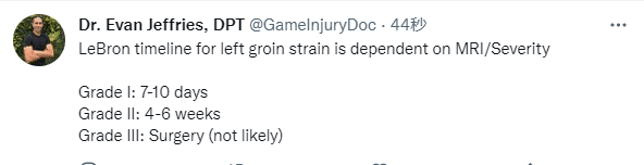 詹姆斯的伤势如何?医学专家Evan Jeffries表示,詹姆斯左侧腹股沟拉伤的复出时间表取决于受伤的严重程度,他将接受核磁共振检查;若一级轻微拉伤,需要休养7-10天;若是二级拉伤,至少休战4-6周;若是三级拉伤,需要手术,这种情况不太可能发生。
