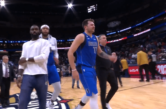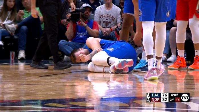 东契奇首节两次摔倒,一次是面对丹尼尔斯斯摔倒,手肘好像蹭了一下,捂着手肘有些痛苦;东契奇单挑海斯再次摔倒;镜头还拍到东契奇站在场上以及替补席捂着跟腱,所幸身体无碍。