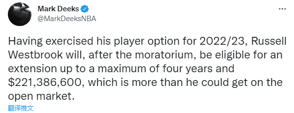 24直播网06月30日讯 ,据NBA分析师Mark Deeks报道,在执行下赛季球员选项后,威少将有资格与湖人签下4年2.21亿美元的顶薪提前续约合同,这比他在自由市场上能获得的合同更大;威少该合同最后一年的年薪将达到6127万美元,但是考虑到届时工资帽也将上涨,这份年薪的大小暂时无法衡量。