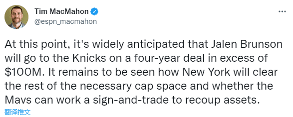 24直播网讯 北京时间6月29日,东契奇的冲冠帮手布伦森可能离队,据名记Tim MacMahon报道,预计尼克斯将给布伦森一份4年超1亿美元的大合同,联盟内部人士普遍认为布伦森会加盟尼克斯而不是留在独行侠;尼克斯不仅给大合同,还承诺首发控卫,正清理薪资空间疯抢布伦森。