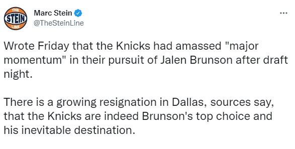 尼克斯疯狂追求独行侠二当家,根据记者MarcStein报道,独行侠内部愈发认为杰伦-布伦森的首选是尼克斯;根据之前的报道,独行侠愿意为布伦森提供一份类似范弗利特与猛龙的合同(4年8500万美元),但独行侠拥有鸟权,可以和布伦森签约5年。