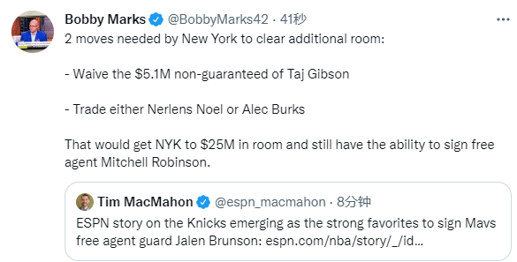 一是裁掉吉布森;而是交易诺埃尔或者伯克斯,这样的话尼克斯拥有2500万美元的薪资空间,不仅能签下布伦森,还能续约自由球员米切尔-罗宾逊。