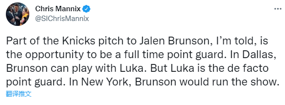 除了薪资空间之外,据体育画报记者Chris Mannis报道,为了追求布伦森,尼克斯还承诺让其担任球队的主力控卫;在达拉斯独行侠,布伦森和东契奇共同担任控卫,而在尼克斯,布伦森将掌控该位置。