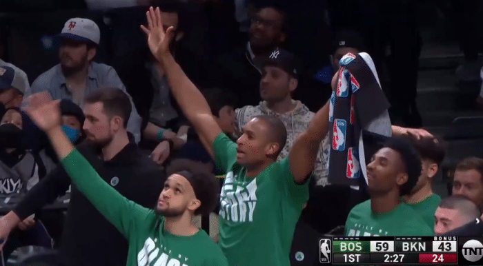 目睹塔图姆的隔扣,场下凯尔特人的球员们也都疯狂了,他们站起来欢呼庆祝,这个球确实太霸气了。