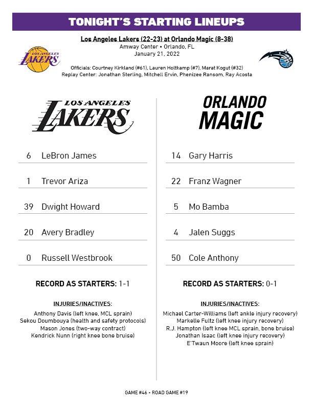 24直播网01月22日讯 ,湖人正式开启东部六连客,湖人今日对阵魔术的首发五虎是詹姆斯、威少、霍华德、阿里扎和布拉德利,连续三场使用这样的首发阵容,老魔兽重返奥兰多,继续担任湖人首发中锋。