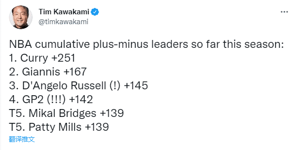 在正负值前15名榜单上,勇士队四名球员上榜——库里、小佩顿、追梦格林和维金斯,篮网队仅有米尔斯一人,湖人队无人上榜,如此数据也能反应出为何湖人和勇士的战绩相差这么大。