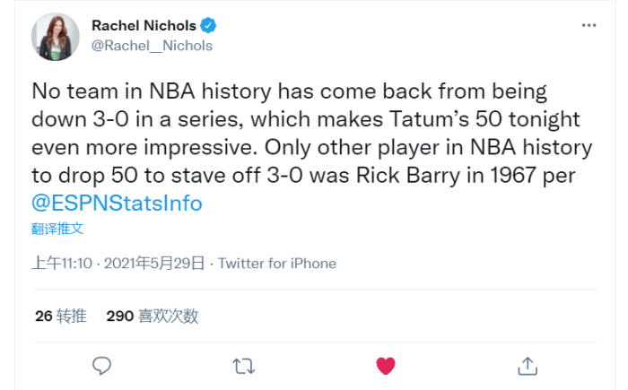 第五,历史上此前只有1967年的里克巴里在球队0比2落后的情况下第三场狂砍50分,塔图姆成为历史第二位做到这一点的球员!