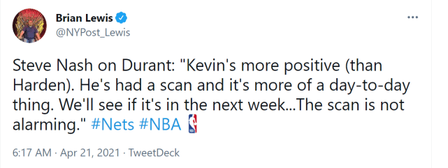 “凯文的情况(比哈登)更乐观一些。他已经接受了核磁共振检查,更接近于每日观察的状态。我们会看看是不是在下周可以复出……”纳什在采访中说道。