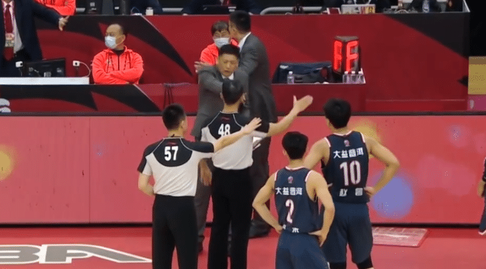 第三节的比赛也是发生了小插曲,广东队的主教练因为不满裁判的吹罚被驱逐出场,我们再来回顾一下事件的始末,第三节比赛还剩下5秒的时候,广东队最后一攻,马尚持球过半场,北控外援哈里斯有个很明显的推任骏飞的动作,但是裁判吹了双方犯规,任骏飞也是十分的委屈,他冲着裁判摊手表示无奈。