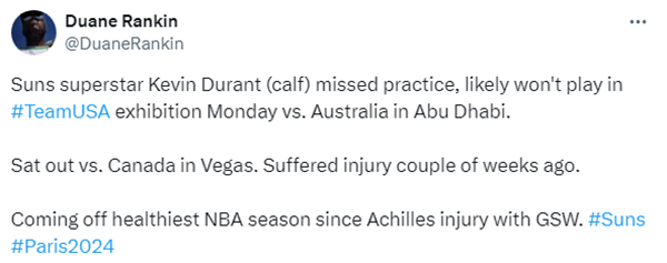 目前杜兰特正在养伤,据太阳记者Duane Rankin报道,杜兰特因小腿伤势继续缺席训练,他很可能不会出战下周二在阿布扎比举办的美国男篮与澳大利亚的热身赛;此前杜兰特因伤缺席与加拿大的热身赛,他的小腿是在几周前受伤的。