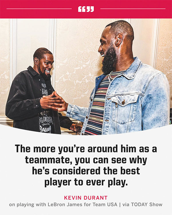 近日谈到了和詹姆斯当队友的经历,杜兰特公开表示:他对比赛的热情和能量是有感染力的。你和他做队友的时间越长,就越能知道他为什么被视为是有史以来最好的球员(goat)。