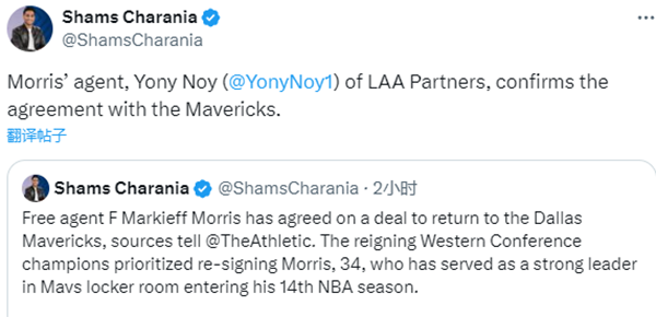 24直播网讯 北京时间9月8日,据名记shams报道,35岁的自由球员前锋马基夫-莫里斯已经同意与独行侠达成一份合同,作为上赛季的西部冠军,独行侠优先考虑与其续约;大莫将在独行侠开启生涯第14个赛季,预计他将继续担任球队更衣室领袖的角色。