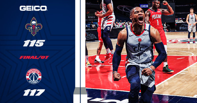 奇才(22-33):威斯布鲁克36分15板9助、比尔30分4板6助、八村塁6分、加福德18分7板、内托6分4板