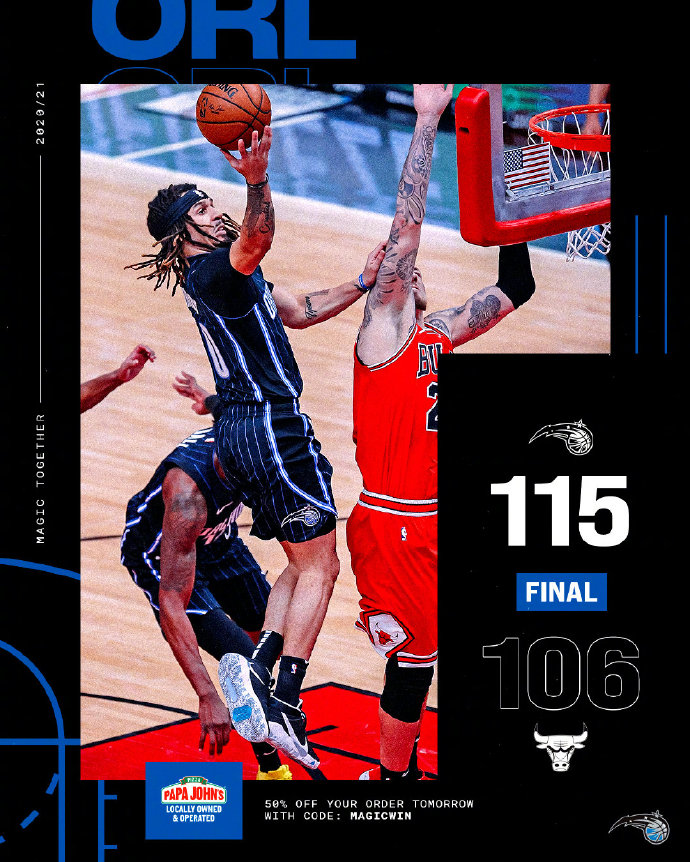 24直播网4月15日讯 NBA常规赛,公牛主场迎战魔术。公牛近期遭遇了三连败,目前排在东部第十,领先身后的球队仅两个胜场。魔术更是遭遇了六连败,排名仅高于活塞,列东部倒数第二。一开场,双方均很快进入状态,连续投篮命中,魔术多点开花,领先10分结束首节。次节初段魔术延续火力继续保持领先,后半段公牛突然发力,一波12-3将半场分差缩小到1分。易边再战,武切维奇里突外投帮助公牛咬住比分,无奈魔术火力全开连中四个三分,三节打完魔术领先21分。末节争夺,公牛如梦方醒,拉文连续三分将分差缩小到个位数,恩尼斯三分杀死比赛。最终,魔术客场战胜公牛,结束六连败的同时送给对手四连败。
