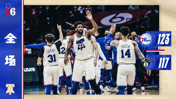 24直播网4月15日讯 今日NBA常规赛,篮网客场挑战76人,本场比赛欧文复出,杜兰特格里芬轮休。比赛开始后,76人率先发力取得9分领先,欧文首节发挥出色,自己得分的同时不断串联队友,篮网始终紧咬比分,首节结束76人32-28领先篮网4分。第二节比赛前半段,托拜亚斯-哈里斯里突外投接连得分,恩比德后半段发力接连站上罚球线,篮网半场58-65落后7分。下半场比赛开始后,篮网进攻效率降低,76人内外兼修不断扩大领先优势,分差一度来到16分,之后欧文发力连续得分替篮网缩小分差,三节战罢,篮网依然落后76人10分。最后一节,76人保持出色外线手感,接连打出进攻高潮将分差扩大至20分,篮网之后发起反扑一度将分差缩小至3分,76人依靠罚球稳住胜局,最终76人123-117主场击退篮网。
