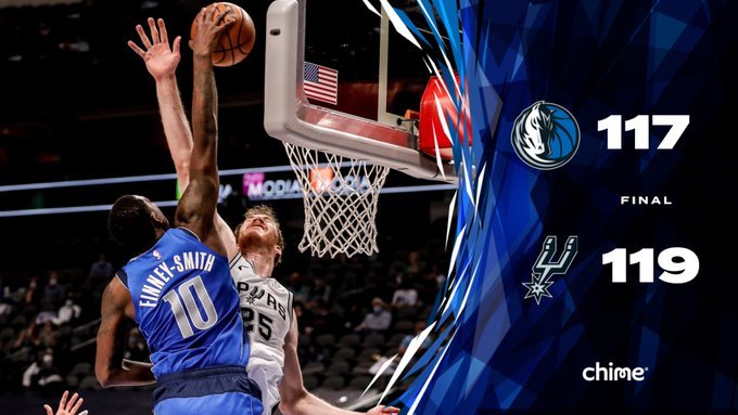 独行侠今日坐镇主场迎战马刺,独行侠凭借近期7场比赛赢下6场稳住第七的排名,原本排名高于独行侠的马刺却在一波5连败之中跌出了西部前八。首节争夺马刺状态出色抢先机并取得领先,不过独行侠方面依靠波尔津吉斯首节独砍13分5篮板的发挥及时止血并在节末追平比分,次节对决独行侠在拉锯战中再一次突围,节末多点开花的独行侠用一波15-3的进攻高潮取得领先并带着5分优势进入下半场。下半场争夺马刺抢到两节比赛的开局,第三节节初一波13-4的攻势帮助他们反超比分,第四节开局他们再送11-2的攻势拉开比分,独行侠为两次糟糕的开局买单,不过两次他们都在最后时刻上演追分大戏,末节凭借东契奇连投带罚拿下4分独行侠抹平比分,奈何一整场都表现出色的德罗赞又一次取得进球,他的致命跳投帮助马刺上演绝杀。最终,马刺客场绝杀独行侠结束5连败。
