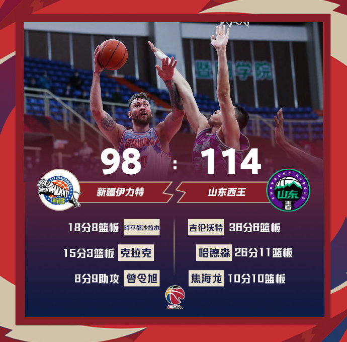 CBA常规赛倒数第二轮,新疆与山东侠路相逢,目前新疆已经锁定常规赛第四名,山东则暂列第五,此役高诗岩因伤缺阵。首节两队均是内外结合,比分也始终紧咬,但新疆老大难的罚球问题还是让他们处于追赶者的角色,次节周琦因为身体原因被迫下场,新疆的进攻几次断电,山东则是多点开花很快就确立了两位数的领先优势。第三节山东在哈德森的带领下下起一阵三分雨,单节八记三分射得新疆晕头转向,节末一波8-0的攻击波后更是将分差扩大到24分,末节新疆一度送出10-0的攻势看到了追平的希望,但吉伦沃特单节爆砍17分彻底杀死比赛悬念,最终山东114-98击败新疆,取得三连胜的同时也送给对手三连败。