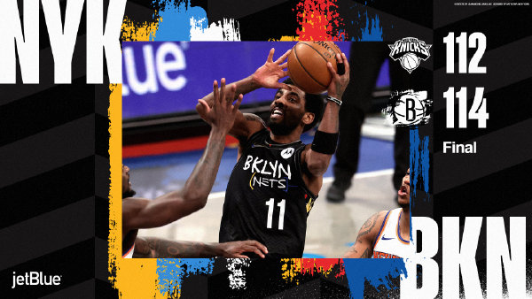 客场不敌公牛之后,篮网回到主场背靠背迎战同城死敌尼克斯,休战两场的哈登今日迎来复出,不过哈登这场比赛仅仅出战不到5分钟,便因腿筋不适退出比赛。缺少哈登的篮网只能依靠欧文独立挑大梁,然而纵使欧文半场就轰下23分的高分,但双拳难敌四手的他们难以阻止多点开花的尼克斯,前有罗斯暴走攻下15分,后有布洛克外线爆发连中三记三分同样拿下16分,尼克斯凭借着角色球员火热发挥取得10分领先结束上半场。下半场的尼克斯自乱阵脚第三节末4分30秒里仅得2分,这波得分荒让他们自毁长城丢掉主动权,而篮网用一波14-2的进攻高潮扭转局势,末节之争篮网虽然一路领先但迟迟无法拉开比分,伯克斯最后时刻命中追平三分重新制造悬念,不过鲁瓦乌最后关键进攻篮板,加上格林制造犯规上演罚球绝杀。最终,篮网主场惊险击败尼克斯拿下比赛。