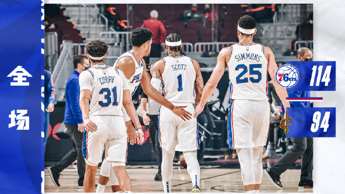 76人:西蒙斯、小库里、格林、哈里斯、斯科特