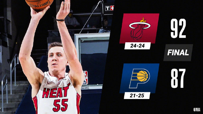 24直播网3月31日讯 步行者坐镇主场迎战热火,目前两支球队在东部一个排名第8,一个排名第9,且双方差距也只有1场而已,这也是一场不折不扣的季后赛席位争夺战,奥拉迪波和纳恩缺席了本场比赛。首节热火外线双枪与步行者内线双塔展开对飚,然而决定比赛走势却是两位替补,麦克德莫特和萨姆纳的三记三分帮助球队取得领先,次节步行者一度将分差拉大到两位数,不过节末他们的进攻却突然哑火,热火则在邓罗和希罗带领下打出一波13-1的高潮将分差缩小至2分。下半场两队又经历了过山车般的起伏,热火经历了开局低迷后奋起直追,靠着巴特勒的强打和邓罗的三分终于抹平了15分的分差,关键时刻步行者陷入5分多钟的得分荒,眼睁睁地看着对手将分差拉大。最终热火客场92-87逆转步行者,赢得了进军季后赛道路上的一场关键战役。