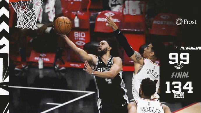NBA常规赛继续进行,76人主场迎战马刺。76人目前高居东部第一,球队也在上一场比赛中大胜奇才取得四连胜,但当家球星恩比德的受伤给胜利蒙上了一层阴影,好在恩比德此次伤病并不严重,据消息称2-3周后即可复出。马刺目前位列西部第七,阿尔德里奇已和球队达成协议不再出战,德罗赞也因个人事务缺阵。本场西蒙斯迎来复出。一开场,面对旧主的丹尼-格林毫不手软,4投全中独得11分,帮助76人领先11分结束首节。次节比赛马刺奋力反击一度把分差缩小到4分,西蒙斯连续得分帮助球队稳住局势,半场打完76人60-52领先马刺8分。易边再战,76人火力全开,马刺无力招架,波波维奇五上五下也于事无补,马刺完全被打散,76人单节拿到46分,领先33分进入末节。末节彻底沦为垃圾时间,但76人势头不减三分连续命中,最终76人主场大胜马刺,喜获五连胜。