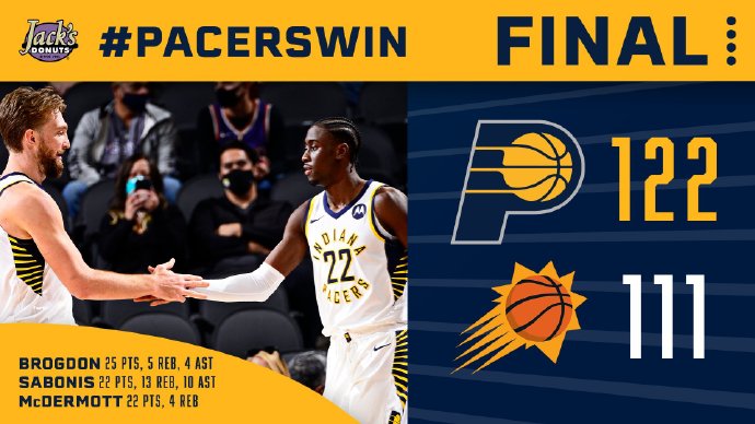 步行者(17-20):布罗格登25分4板、麦克德莫特22分、萨博尼斯22分13板10助4断、特纳16分8板、勒韦尔13分7板、贾斯汀-霍勒迪10分