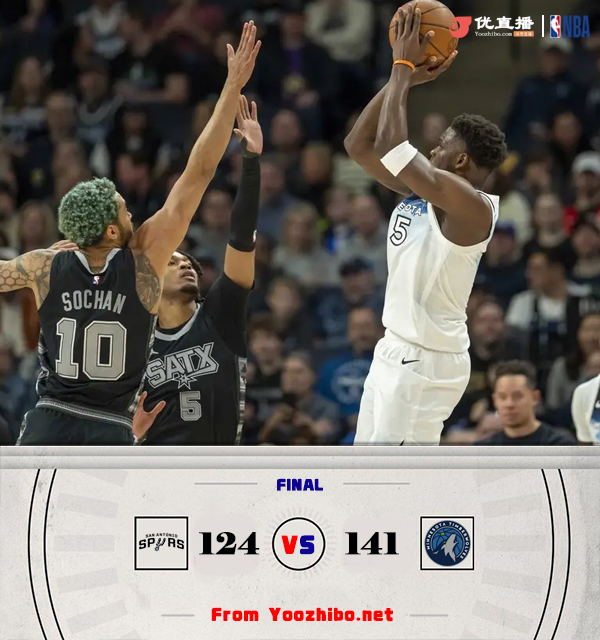 北京时间3月10日讯 NBA常规赛,森林狼主场迎战马刺。森林狼4连胜后36胜29负西部第7,马刺则是26胜35负西部第13。本场比赛,戈贝尔迎来复出。比赛开始,马刺开场慢热,麦克丹尼尔斯帮助球队打出不错开局,福克斯和瓦塞尔内外线接连止血回应,爱德华兹接连三分命中单节上双,森林狼首节领先8分,次节双方展开对攻战,康利连续三分命中,卡斯尔接连突破回应,里德和福克斯也在外线对飚,双方次节打成31平。下半场,双方继续对攻,马刺多点开花追分,爱德华兹接连突破回应,分差始终保持在10分左右,末段森林狼连续3记三分拉开15分领先,末节森林狼继续发力,戈贝尔接连内线吃饼拉开20分以上领先,随后双方逐渐换上替补练兵,最终森林狼141-124击退马刺,拿到5连胜。
