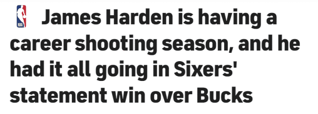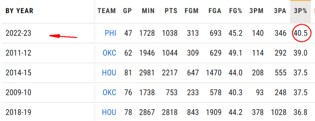 24直播网讯03月05日,76人133-130击败雄鹿,终结了对方的16连胜。哈登成为头号功臣,轰下38分9篮板10助攻,三分9中5。美媒CBS体育指出,哈登本赛季的三分命中率是生涯最高的表现,换言之,这是大胡子三分最准的一季。