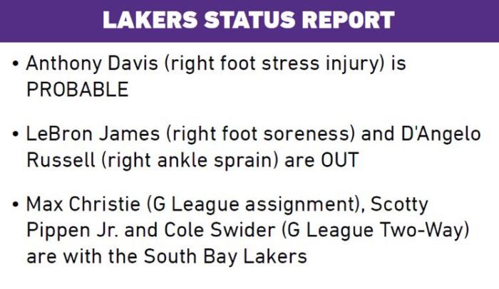 24直播网讯03月05日,湖人官方公布下一场对阵勇士的伤病报告,詹姆斯(右脚酸痛)和拉塞尔(右脚踝扭伤)缺席比赛,浓眉(右脚应激伤病)大概率出战,克里斯蒂、小皮蓬和斯威德都在发展联盟,也缺席与勇士的比赛;勇士队库里、伊戈达拉预计复出,维金斯仍未归队继续缺席。