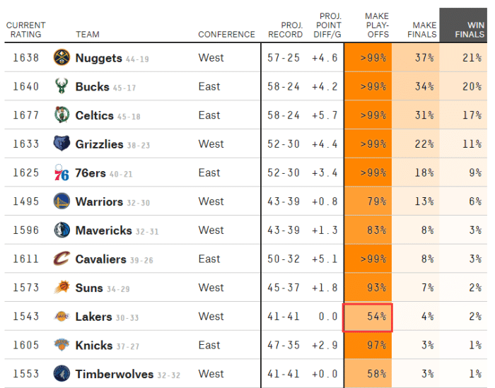 常规赛最后38天,湖人还剩下19场比赛,对于湖人来说,每一场输赢都可能决定球队的排名;根据FiveThirtyEight最新预测,湖人本赛季最终战绩为41胜41负,有54%的概率打进季后赛,进入总决赛概率为4%,夺冠概率为2%。