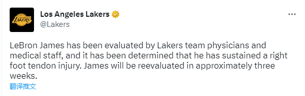 湖人记者Ryan Ward发推写道:根据湖人的最新伤病报告,在接受再次评估前,詹姆斯将因右脚肌腱伤势缺席至少10场。湖人本赛季的常规赛还剩19场。我的猜测詹姆斯本赛季至少不会再出战常规赛。