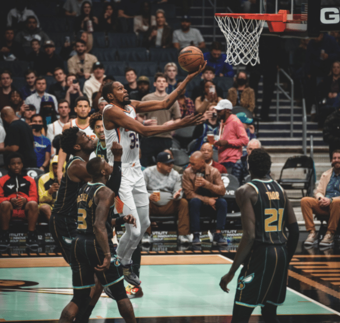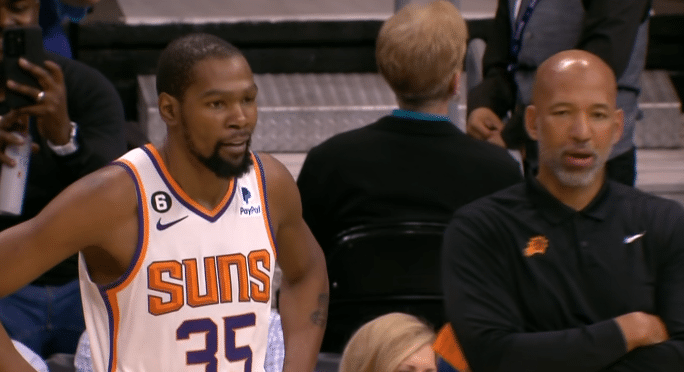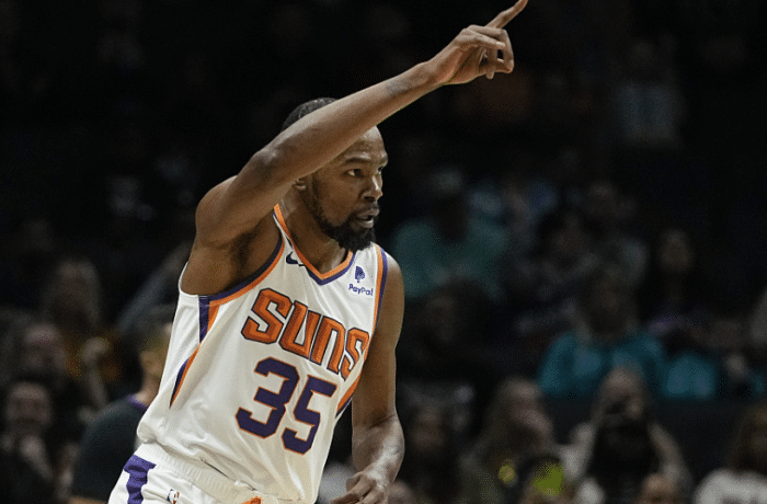 杜兰特搭档布克、保罗、艾顿和奥科吉首发出战,杜兰特身穿35号球衣出战,第一节10分06秒杜兰特杀到禁区上篮得分,打进太阳生涯第一球,随后杜兰特大帽马威,在太阳反击中,布克助攻杜兰特轰进三分,再加上布克和艾顿输送火力,太阳11-0开场,之后黄蜂8-0反扑,杜兰特再次大帽马威后下场休息,首节上场5分钟,4投2中拿到5分2盖帽。