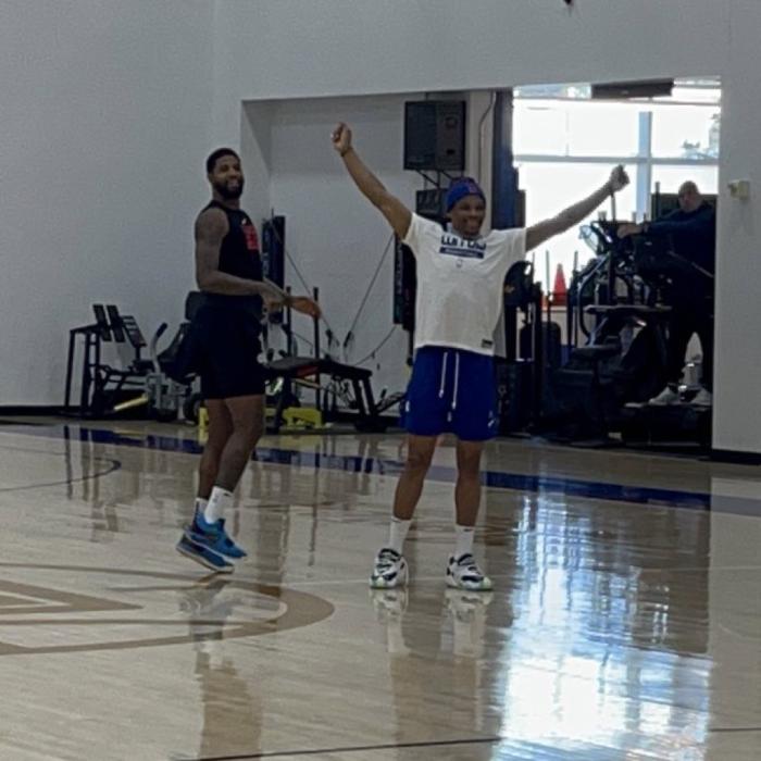 在快船队今天的训练中,威少身穿快船训练服,并且把球衣绑在身后,戴着快船队蓝色发带参加训练,泰伦-卢安排威少和普拉姆利、戈登、海兰德一起训练,威少持球组织进攻,队友上前给他挡拆,威少突破后把球传给空位的队友;训练中,威少助攻戈登命中三分,助攻普拉姆利轻松扣篮。