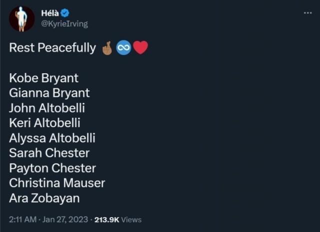 作为科比的忠实粉丝,欧文列出了当时事故去世的9人名单,篮网球星欧文更推为科比失事飞机上的9个人悼念 ,并配文写道:“安息吧。”