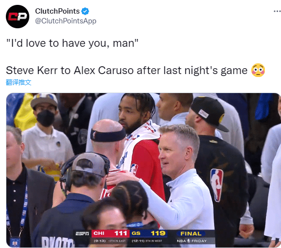 24直播网12月04日,勇士主帅科尔招募卡鲁索一幕曝光,在勇士击败公牛赛后,科尔搂着卡鲁索进行了一番亲切交流,期间科尔表示:我很想把你招过来,伙计。