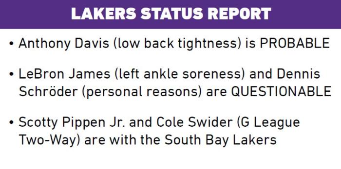 24直播网12月04日湖人官方公布下一场对阵奇才的伤情,浓眉(背部紧张)大概率出战(75%可能性出战)、詹姆斯(左脚踝酸痛)和施罗德(个人原因)出战成疑(50%可能性出战),小皮蓬和斯威德仍旧跟随南湾湖人打比赛。