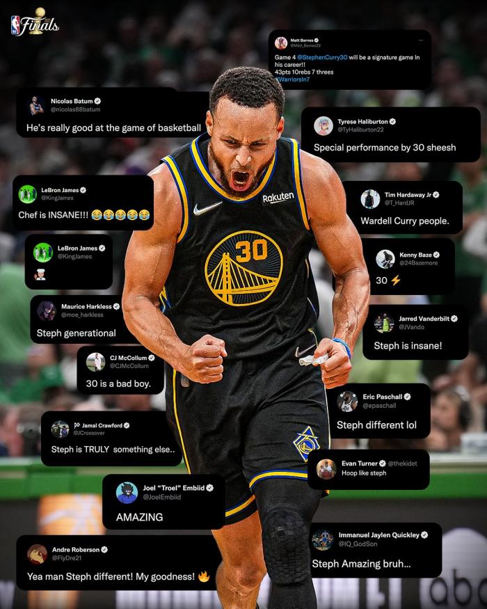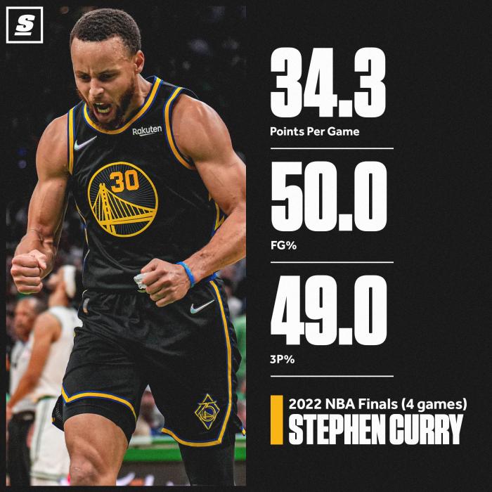 总决赛前四场,库里场均狂砍34.3分6.3篮板3.8助攻2抢断,投篮命中率为50%,三分命中率为49%,成为乔丹和杜兰特之后第三位总决赛场均30+且投篮命中率至少50%、三分命中率至少45%的球员,当年乔丹和杜兰特都是28岁,34岁库里成为该纪录最年老球员。