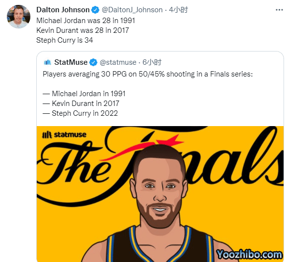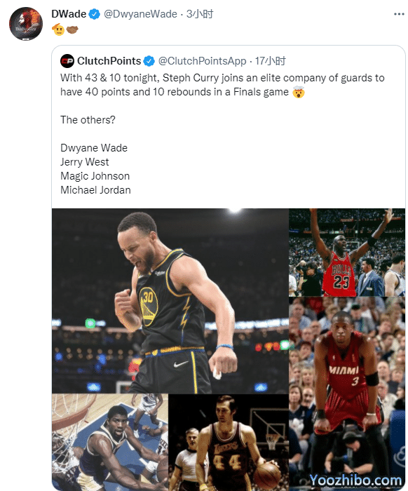 库里总决赛G4轰下43分10篮板,成为乔丹、魔术师、韦斯特和韦德之后史上第5位总决赛单场40分+10篮板的后卫球员,韦德转发并且向库里表达敬意。