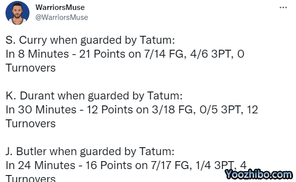 在今年季后赛中,库里被塔图姆防守时,8分钟14投7中、三分6中4拿到21分且0失误;杜兰特被塔图姆防守时,30分钟18投3中、三分5中0中仅拿到12分却有12次失误;换言之,库里打爆塔图姆,杜兰特被塔图姆防死了,如此对比再次体现出库里的强大。