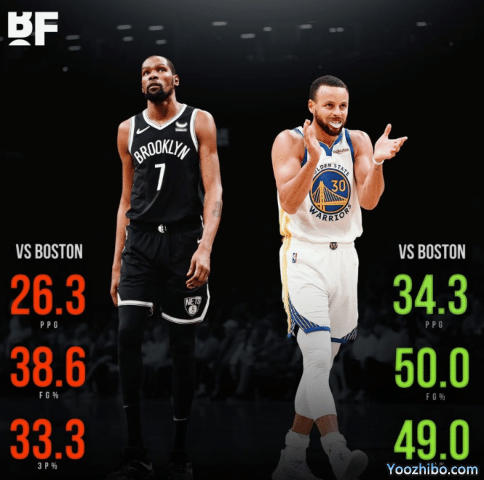 同样是四战凯尔特人,库里场均狂砍34.3分,投篮命中率50%,三分命中率49%,在总决赛舞台上大放异彩,带队冲冠并且冲击FMVP;而杜兰特场均26.3分,投篮命中率38.6%,三分命中率33.3%,首轮0-4被凯尔特人横扫出局。